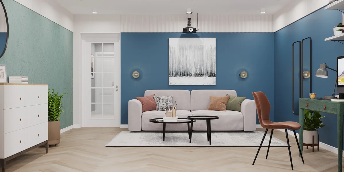 Разные цвета выгодно подчеркивают зонирование помещения. Можно оформить контрастную акцентную стену или сделать мягкий переход между схожими оттенками, подчеркнув единство пространства.