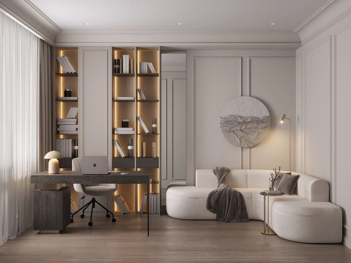 Эргономичный вариант планировки небольшой гостиной – размещение функциональных зон параллельно друг другу. На фото область для отдыха с угловым диваном и панно над ним чуть «утоплена» вглубь комнаты, что создает впечатление приватности, защищенности. Рабочий мини-кабинет расположен у окна, стол выдвинут к центру комнаты. Контраст светлой отделки и стеллажа подчеркивает визуальное разделение помещения на две части.