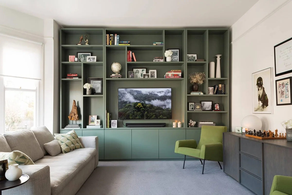 Открытые полки и стеллажи помогают эффективно использовать вертикальное пространство. Они облегчают обстановку, что особенно хорошо «работает» в небольших комнатах. Стеллаж, установленный поперек гостиной, может служить перегородкой между зоной отдыха и, например, рабочим местом.
