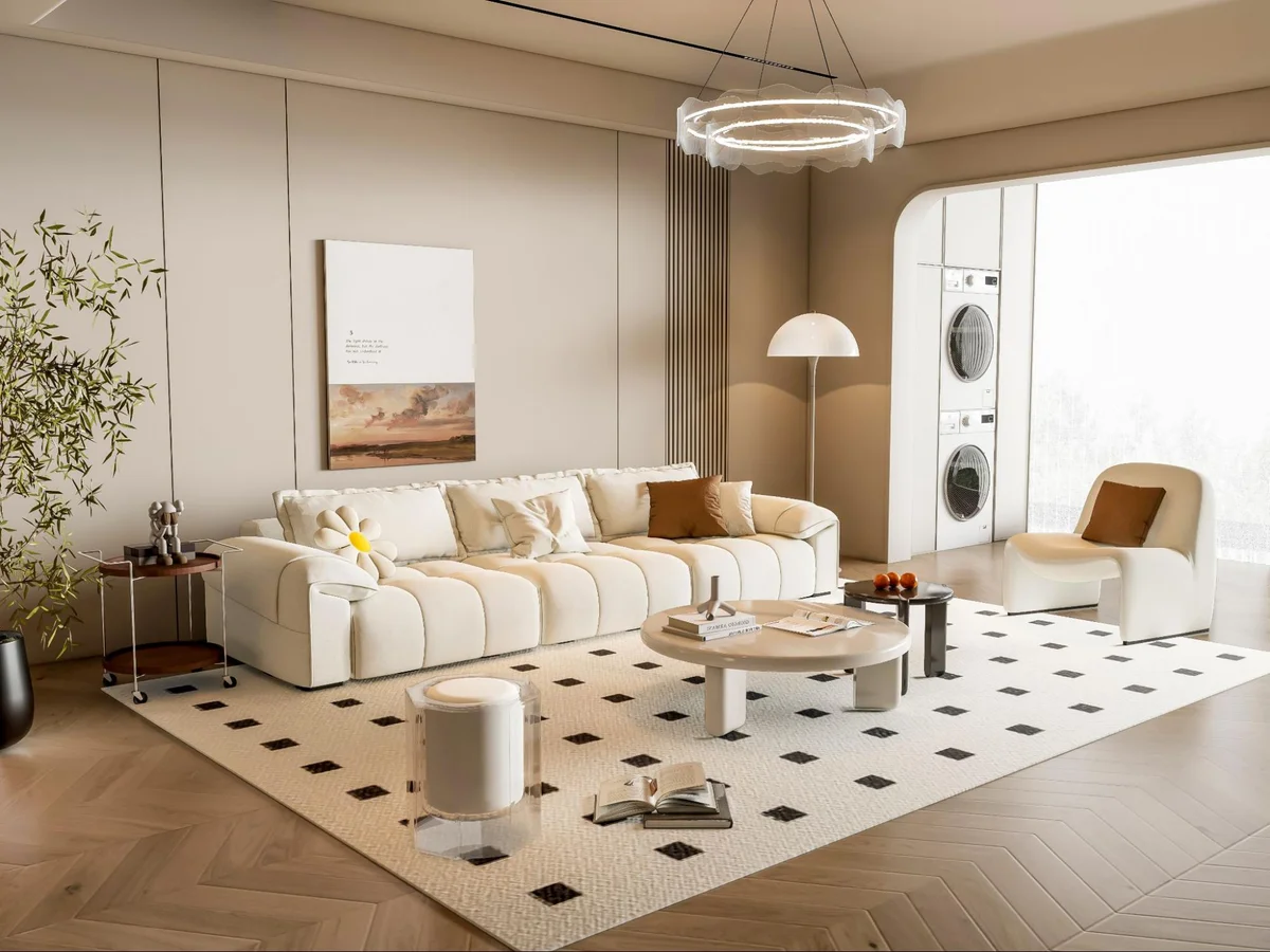 Наглядный пример «галлюцинаций нейросети». Журнальный столик на двух ножках не будет устойчивым. Решение разместить колонну со стиральной и сушильной машиной в гостиной возле панорамного окна нельзя назвать удачным.