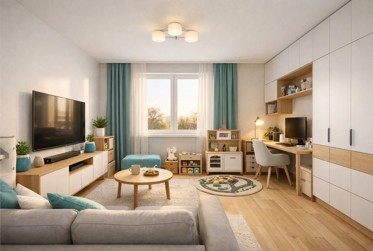 Создай план зонирования для прямоугольной гостиной 4х6 метров, потолки 2,7 метров. Окно в центре широкой стены, дверь напротив. Живут двое взрослых и ребенок 7 лет. Нужно: зона отдыха с ТВ, игровой уголок, зона для работы за компьютером и много места для хранения вещей. Учти правила эргономики для проходов.