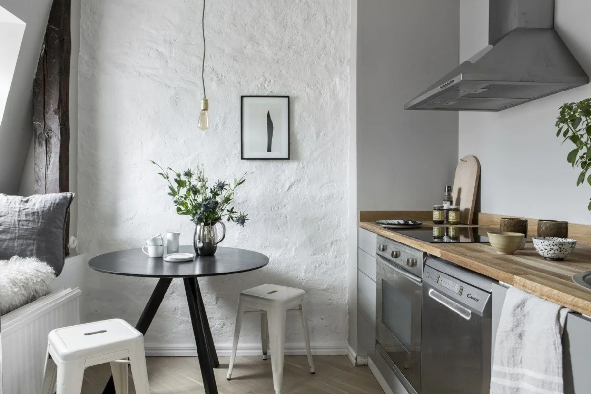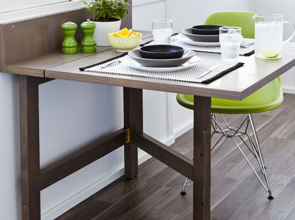 Этот предмет ― идеальный вариант для дизайна маленькой кухни в хрущевке, размером около 5 кв. метров. В сложенном состоянии он занимает совсем мало места, при этом за ним может расположиться семья из 2 или 3 человек, чтобы поужинать или выпить утренний кофе. В нужный момент стол-трансформер легко превращается в полноценную обеденную зону, которая подойдет для приема гостей.