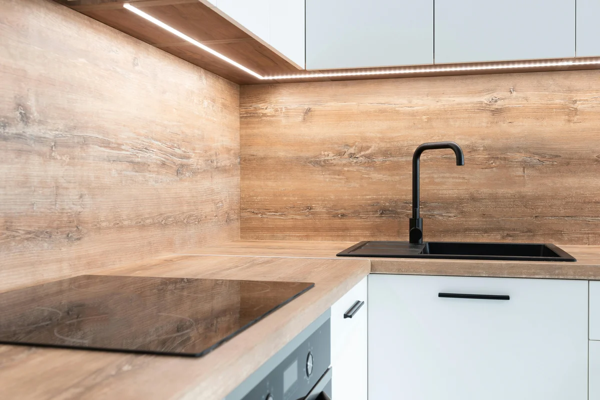 Это дизайнерское решение приносит и практическую пользу. Отсутствие стыка между фартуком и столешницей облегчает уборку, поскольку там не скапливается грязь. К тому же такое оформление защищает от влаги, так как вода не затекает в зазор между столешницей и стеной.