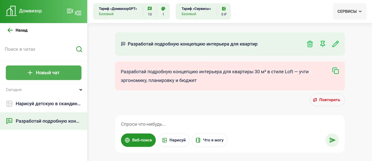Нейросеть для дизайна работает на базе ДомвизорGPT. Фактически это стандартный чат, но заточенный под задачи, связанные с недвижимостью. Можно попросить ИИ составить договор, проанализировать психологический портрет покупателя, найти актуальные тренды дизайна гостиной и т. д. Понравившиеся запросы легко добавлять в закладки, чтобы впоследствии использовать снова.