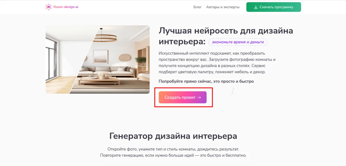 Представьте, что вы планируете ремонт, но не можете определиться с атмосферой в спальне. Хочется чего-то свежего и уютного, но как это будет выглядеть? В нейросети Room-design.ai можно создать дизайн помещения онлайн и бесплатно. Не потребуется даже регистрировать аккаунт: зайдите на главную страницу сайта и нажмите «Создать проект».