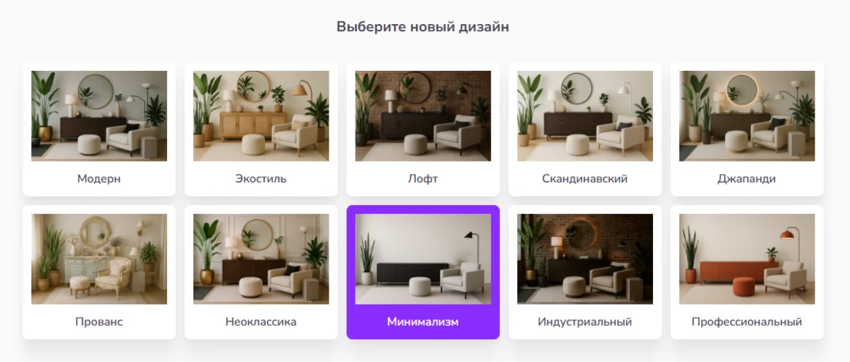 На следующем этапе укажите стиль дизайна интерьера. Мы выберем минимализм. После этого нажмите кнопку «Создать новый дизайн»: дополнительный промпт вводить не нужно. Сервис поменяет отделку стен и пола, добавит текстиль и декор в указанном стиле, но сохранит исходную планировку.
