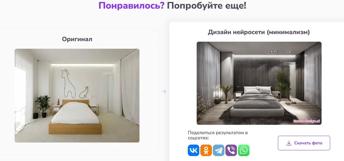Через пару минут получите реалистичную генерацию. Если результат вас не устроил, попробуйте еще раз с тем же или другим снимком. Готовую визуализацию можно загрузить на устройство или отправить другу.