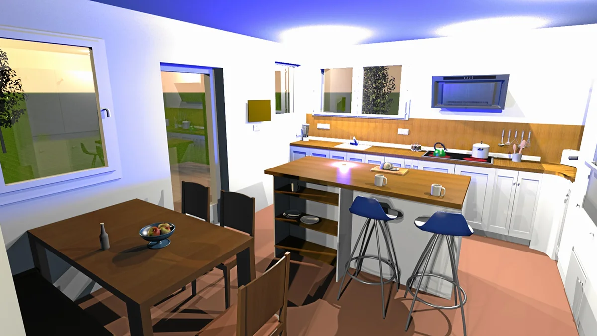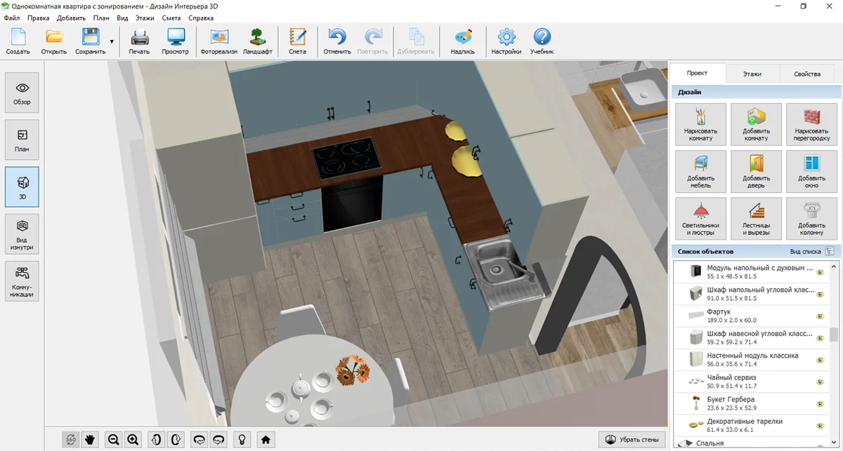 Инструмент для детального 3D-моделирования. Используется в проектировании зоны готовки, обеденного пространства, а также отдельных предметов — например, столов или гарнитуров. Существует в виде приложений на ПК и iPad, но в браузере работает как бесплатная программа для дизайна кухни.