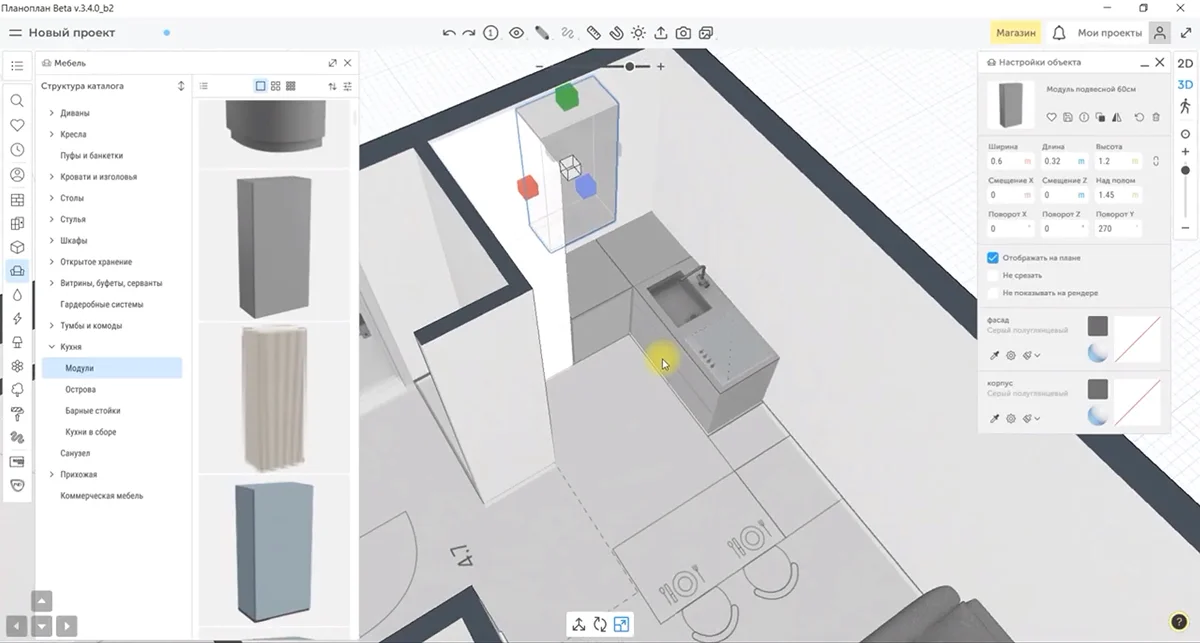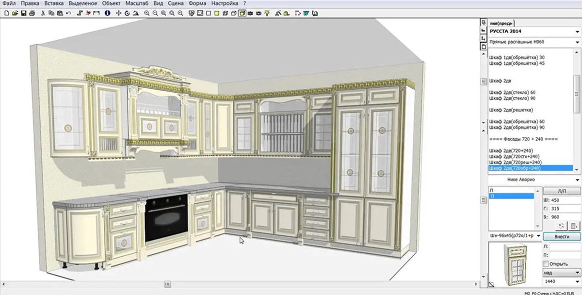 Программа для моделирования кухни с простым интерфейсом и обучением для новых пользователей. Модели мебели в каталоге основаны на реальных товарах из российских мебельных магазинов.