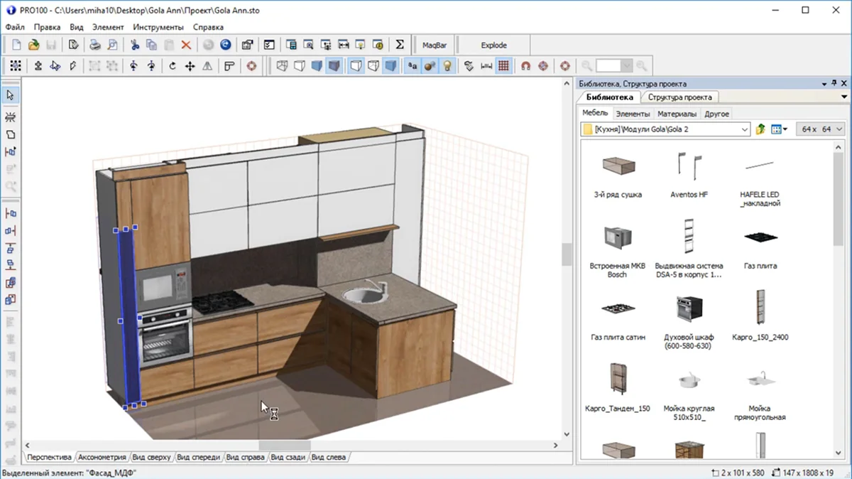 Программа для создания кухни с размерами. Здесь можно не только расставить готовые предметы в интерьере, но и самому спроектировать гарнитур. Протестировать функционал приложения предлагается в бессрочной демоверсии. Ее ограничения — невозможность печати, экспорта проекта, сохранения, составления сметы и редактирования библиотек.