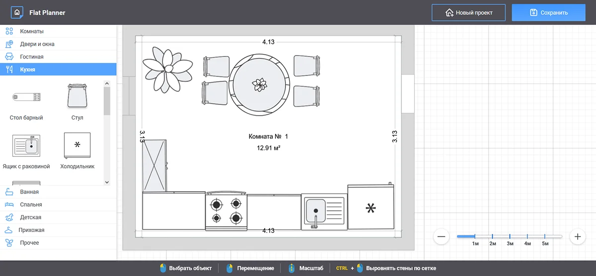 В сервисе можно начертить комнату со стенами неоднородной толщины — например, с нишей или выступом — и продумать ее обстановку. В каталоге есть столы, стулья, плиты, холодильники, вытяжки и другие предметы. Отделка и габариты каждого макета настраиваются.