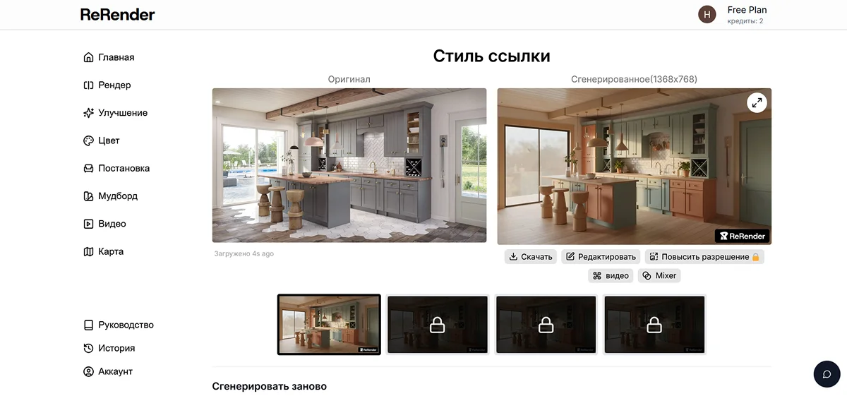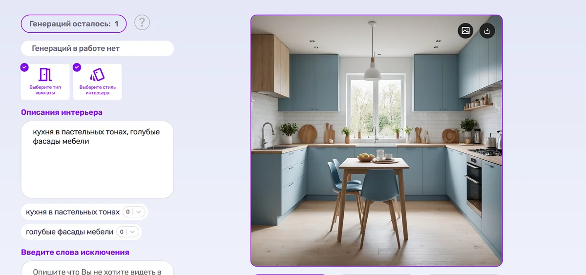 - 3 попытки новым пользователям в каждой категории — генерация по тексту, по фото, редактирование части изображения, подбор мебели.