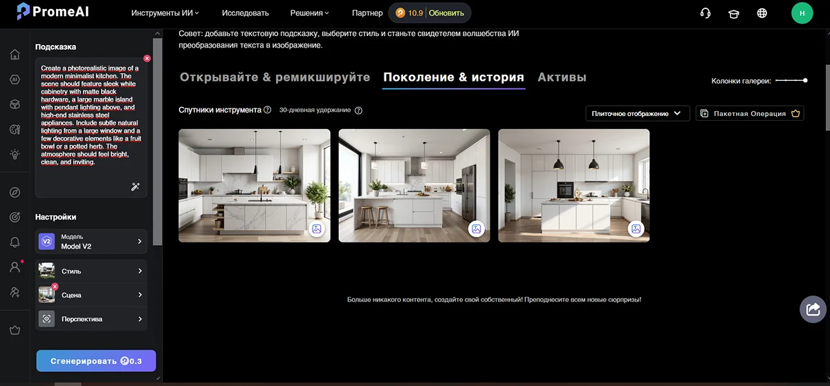 Количество бесплатных генераций: 10 монет (внутренняя валюта сервиса, стоимость зависит от режима).
