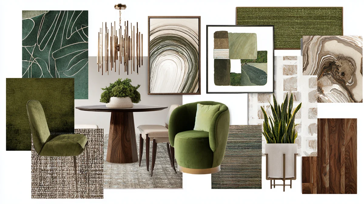 Например, если в вашей подборке много изображений с серыми стенами, зелеными растениями, светлым деревом, панорамными окнами и мягким светом, ваша концепция может звучать так: «Спокойное, естественное пространство, где природа встречается с современным минимализмом».