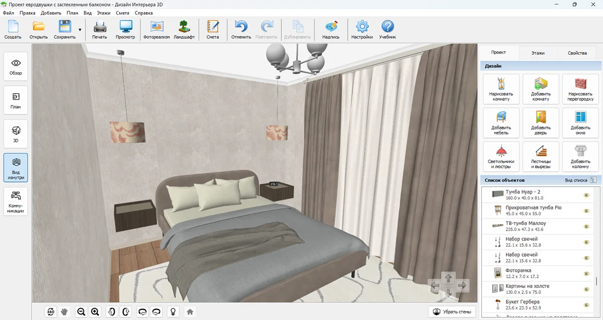 Когда настроение обретет четкие очертания, переходите к 3D-моделированию. Именно на этом этапе вы проверите, влезет ли кровать в нишу, хватит ли света у зеркала, не будет ли «давить» потолок. Фотографии готового дизайна можно экспортировать в PDF или распечатать, чтобы не потерять.